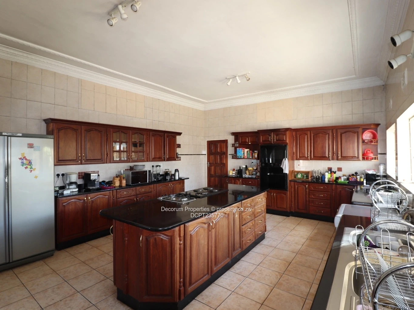 There are 2 lounges, and the family lounge is connected to the dining room. The kitchen is modern and fully fitted. It has a center island, a breakfast nook, and a separate scullery. The kitchen also comes with fitted appliances such as an electric stove, oven, and a gas burner.